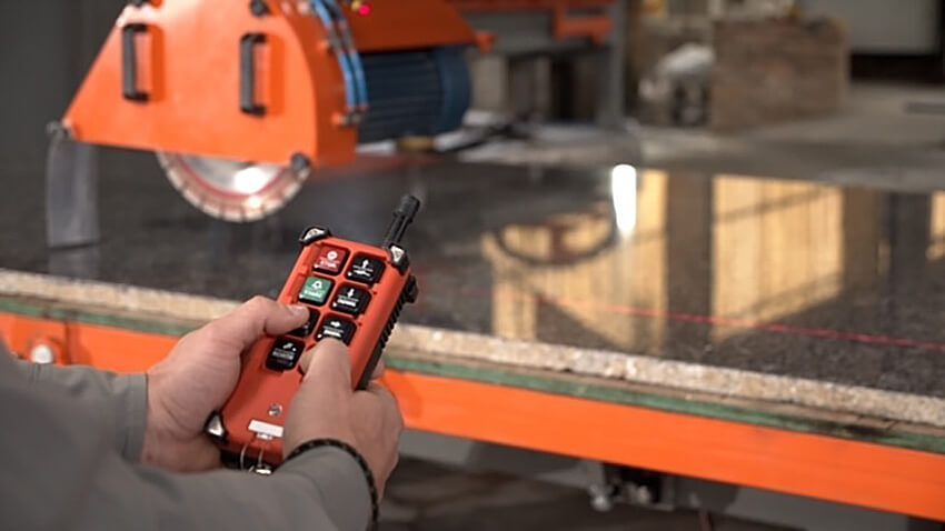 A máquina possui um controle remoto que facilita na hora de fazer o zeramento do disco em cima da pedra. Os eixos X, Y e W se deslocam ao mesmo tempo, reduzindo o tempo de início do corte dos materiais.