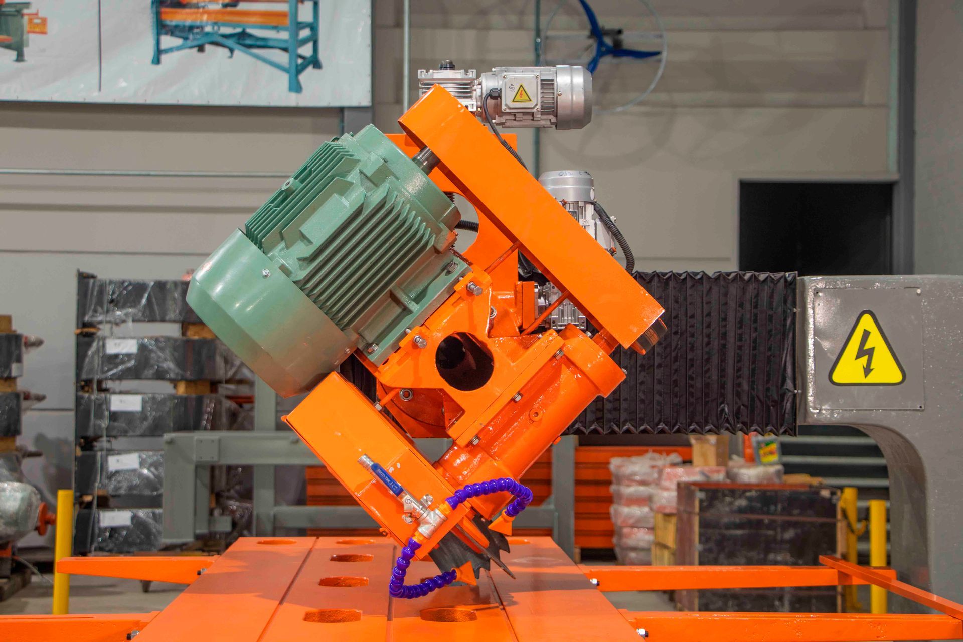 With a total dimension of 5000 x 2200 x 2000 mm, the equipment has a table and head structure made of cast iron, a solid hexagonal roller guide machined on one side and a machined flat bar on the other side, guides bathed in oil and painted in PU.