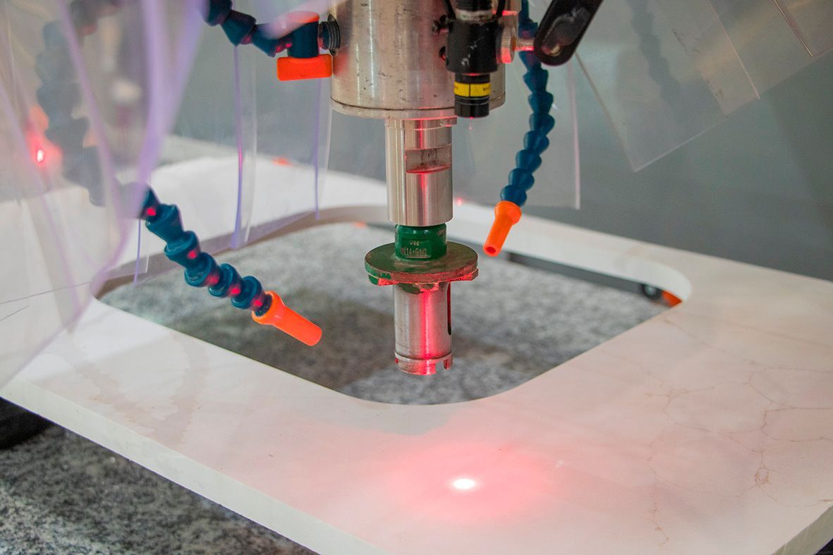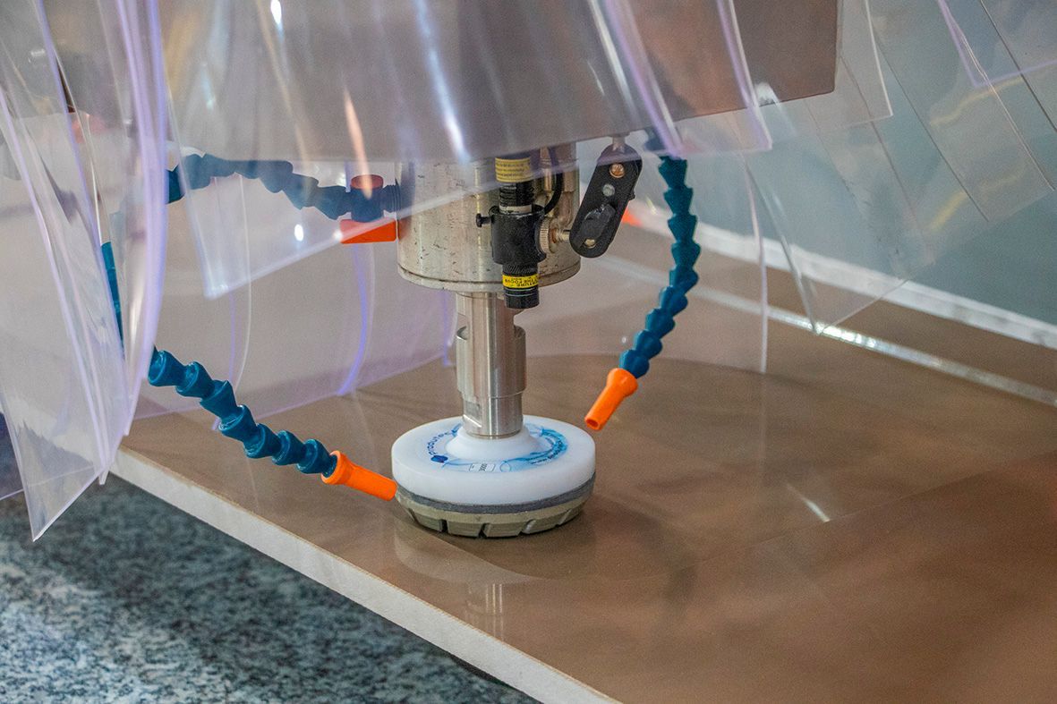 The machine has 3 CNC axes, a granite table with the possibility of 1° and -1° inclination for inclined recesses, linear guides and helical racks for greater precision, vertical pneumatic pressure technology to guarantee polishing of materials and fixation by suction cups vacuum over the entire surface for positioning the parts.